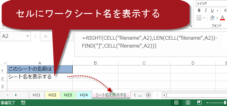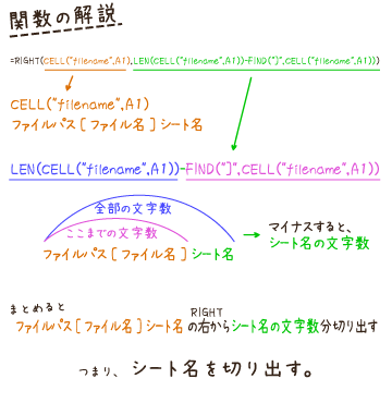 その計算では、LEN関数で全体の文字数を数え、それからFIND関数で全体からファイルパスの文字数を引きます。残るのは、シート名だけとなります。