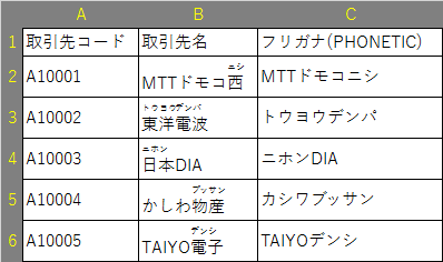 Bの列を見ると、アルファベットはそのままで、漢字にだけフリガナが振られています。
