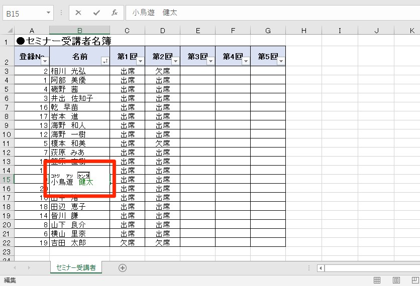 ふりがなを表示されているExcelシートを確認し、ふりがなの修正個所に気づいたら、この手順で編集することができます。