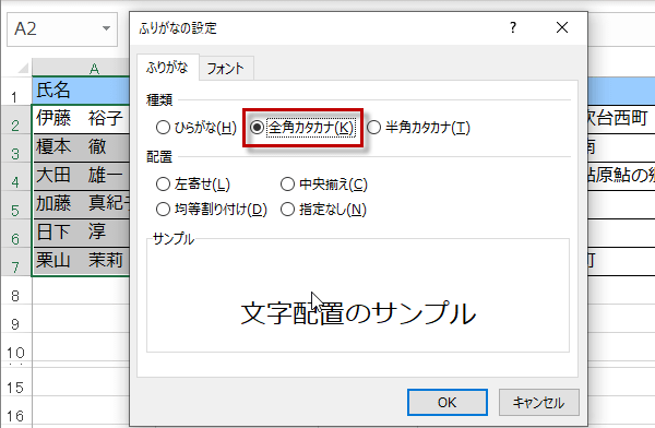 ふりがなの設定のダイアログボックスが出てきます。