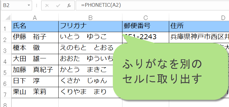 名前などの漢字のセルにフリガナを上に振るだけではなく、隣のセルなど、別のセルへ表示させることもできます。