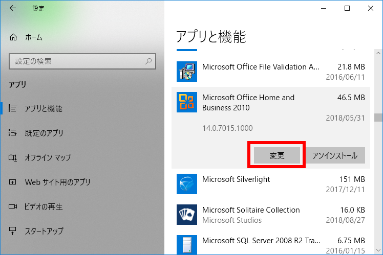 Office2010をダブルクリックすると、このように「変更」か「アンインストール」が表示されます。