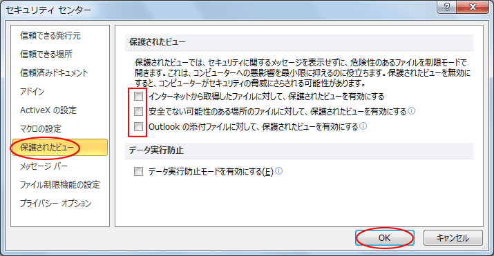 最後に、「…保護されたビューを有効にする」のチェックを3つとも外します。