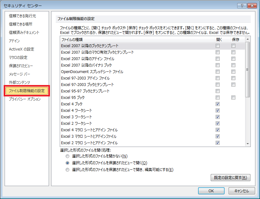 そちらに、✔マークが入っていると、上の表示にあるように、ファイルがブロックされるか保護ビューで開かれることになっています。