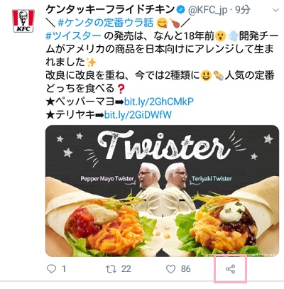 ツイートへのリンクをコピーしたいツイートの詳細ページを開き、右下の「共有アイコン」をタップします。