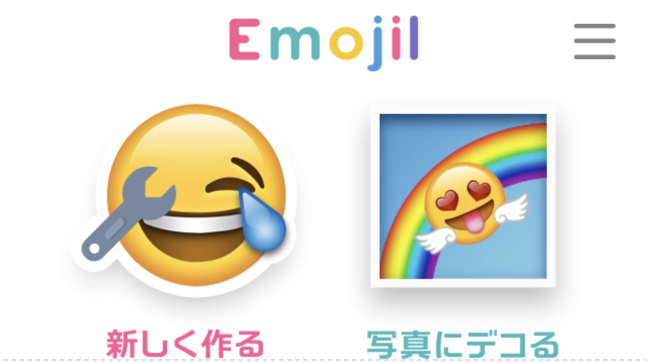 アプリを開くと2つの項目から 作成ができるようになっております。 【新しく作る】 用意されている素材を組合せて絵文字を 作成していく方法 【写真をデコる】 友人などと撮った写真に作成した 絵文字をデコレーションして 作成する方法