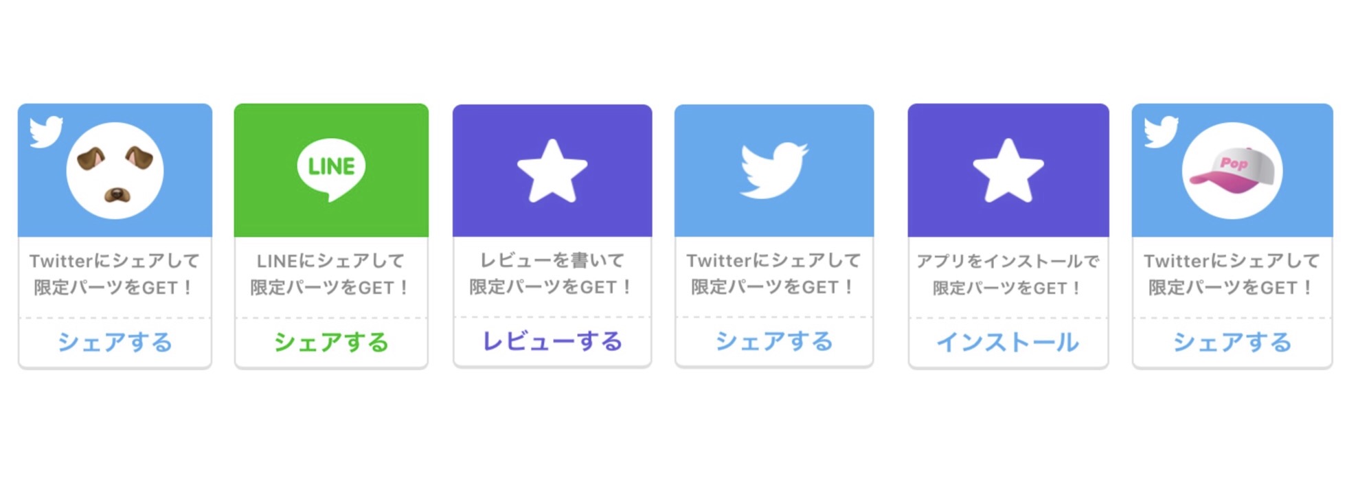 他にも限定パーツをGETする方法があります。 TwitterやLINEにシェアしたり、 アプリレビューを書くと貰えます。