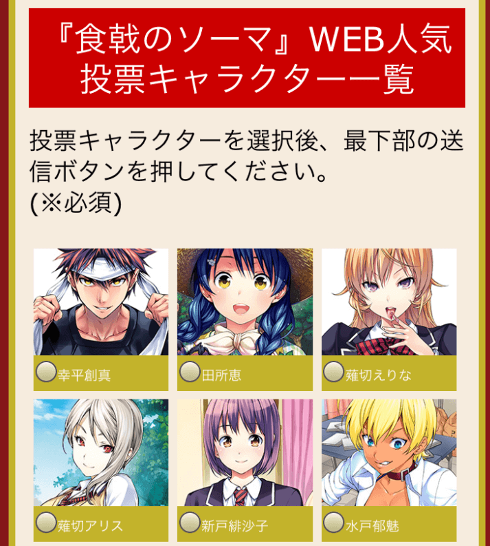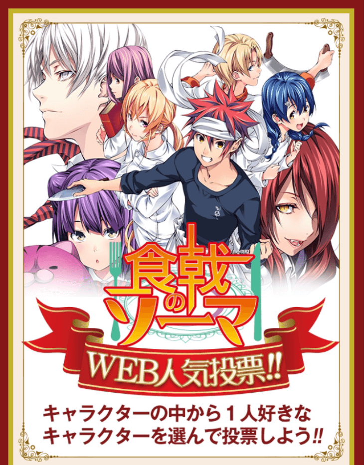 現在ジャンプ+では食戟のソーマのキャラクターの人気投票を行っています。 投票することで、抽選で50名に「食戟のソーマ」のブランケットを贈呈。また特典として投票者全員に「食戟のソーマ」電子書籍版1巻〜10巻までの閲覧する権利が期間限定で付与されます。 投票の締切は12月4日23時59分