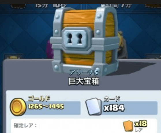 ちなみにコスパのいい、「巨大宝箱」ではゴールドが2,000以上手に入るため、ゴールド狙いで巨大宝箱を開けるのもありです! (アリーナランク8以上の場合)