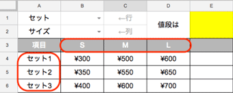 それぞれを使って、データが何列の何行目かが分かり、さらに列と行を指定してデータを取り出すこともできます。