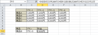 条件検索の式は、「=INDEX(参照,Match(行番号を取得),Match(列番号を取得))」です。