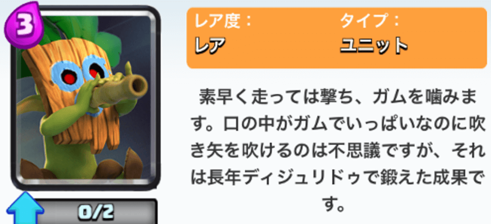 コスト3となっており、槍ゴブリンなどに比べてコストが1高いカードになります。 近接ではなく、遠距離の攻撃を得意としているゴブリンです。槍ゴブリン以上の遠距離攻撃が可能な反面、それほど火力がないようなので、使い所がいまいちなさそうな印象ですw またゴブリンなのでhpは低めです。ローリングウッドにもやられるようです。