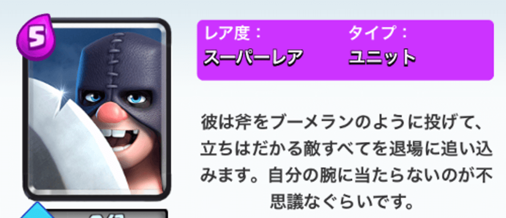 コスト: 5 レアリティ: スーパーレア タイプ: ユニット 攻撃速度: 2.4秒 攻撃目標: 空中/地上 射程: 5 配置時間: 1秒 移動速度: ふつう 説明: 彼の斧はブーメランのように投げて、立ちはだかる敵すべてを退場に追い込みます。自分の腕に当たらないのが不思議なくらいです。 ブーメランのため、行き帰りで2回ダメージがあたるようです。空中と地上に対してブーメランで2回ダメージがあたるためまずまず使い勝手が良さそうです。
