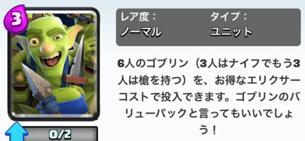 コスト: 3 レア度: ノーマル タイプ: ユニット 配置時間: 1秒 説明: 6人のゴブリン(3人はナイフでもう3人は槍を持つ)を、お得なエリクサーコストで投入できます。ゴブリンのバリューパックといってもいいでしょう。 前衛にゴブリン、後衛に槍ゴブリンの6体の編成となっています。両方ともザップでやられるのが注意です。