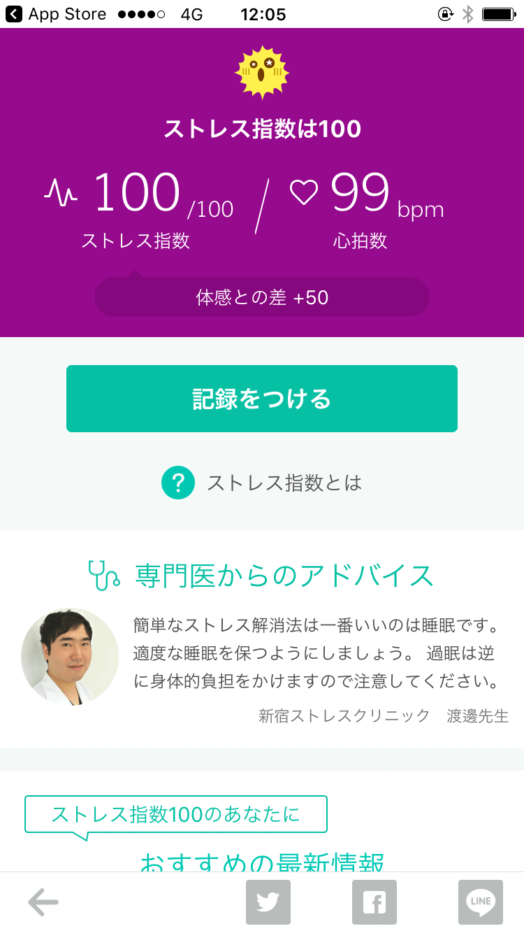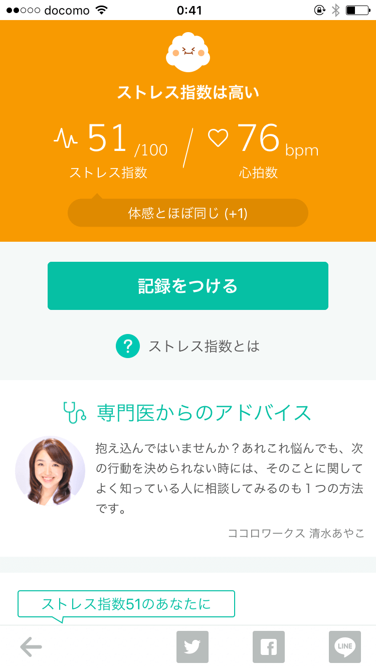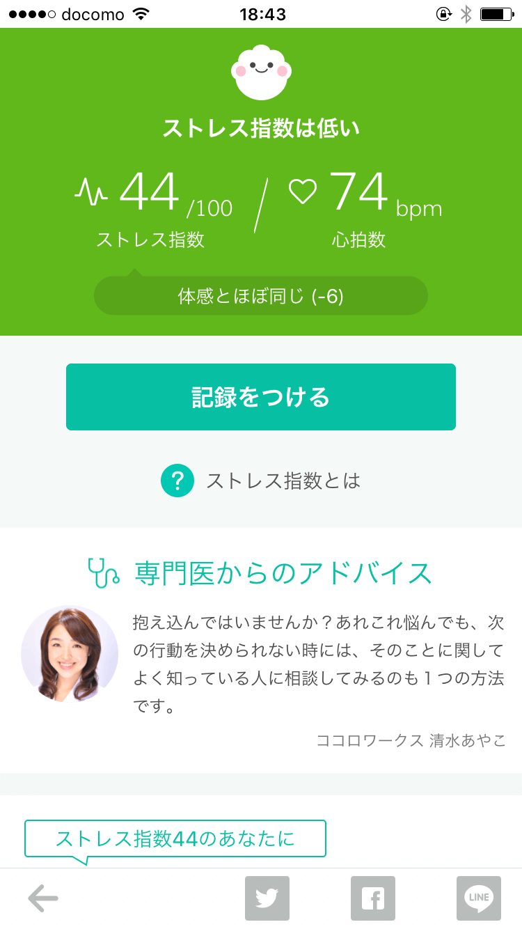 結果的に仕事をするとストレスが下がるという社畜体質が功を奏したのか、ストレス指数100→44への大幅改善です!! 確かに仕事終わりの時間帯ということもあり、仕事に対してストレスというよりも、早く帰れることへの期待感の方が大きかったと思います。こちらも体感的にはそれほど違いはないかと思います。 またストレス応じて、専門医からの一言もついていますね。ストレスが高いときには重宝しそうな情報です。今度ストレスを感じているときに参考にさせてもらいます。