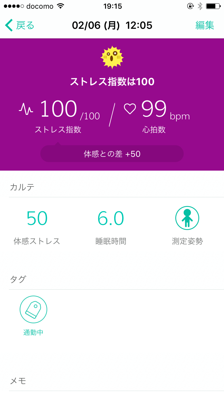 今回は「通勤中」に測定を行いました。ストレススキャンでは測定結果のページで結果に対してタグ付けができます。
