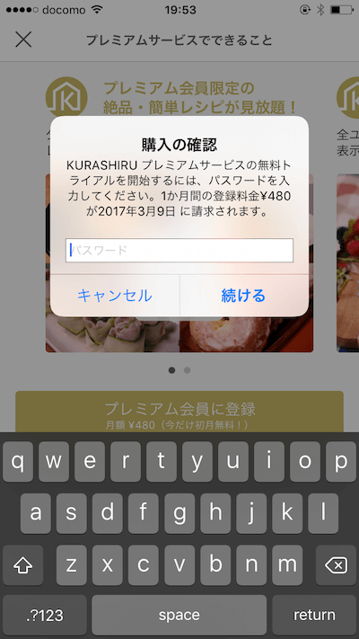 「プレミアム会員に登録」ボタンをタップすると、購入の確認ダイアログが表示されます。 1ヶ月の登録料金と、請求日が表示されます。問題なければ、パスワードを入力し、「続ける」をタップしましょう。