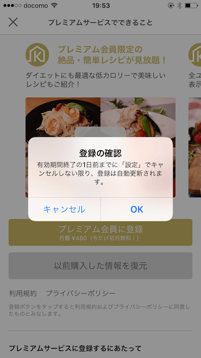 最終確認のダイアログです。自動更新の注意事項が最後に表示されます。「OK」をタップすることで、プレミアムサービスに登録がされます。