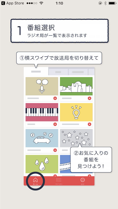 基本的なアプリの使い方がイラストで説明されています。 アプリのトップページで横スワイプで放送局を切り替えられるようです。