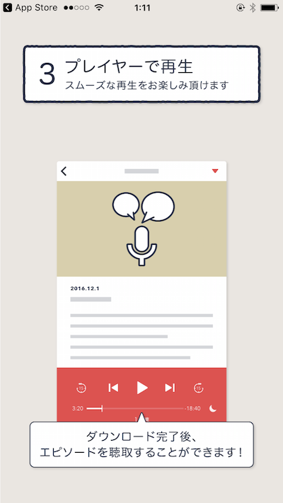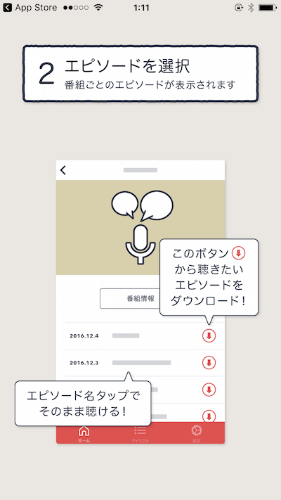右側の↓のマークで聴きたいエピソードをダウンロードできます。さらにエピソードの名前をタップすることで、その場で再生も行えます。