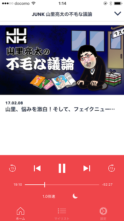 ダウンロードした好きな放送局のエピソードはマイリストに保存されます。このマイリストから聴き始めたエピソードを再生できますし、もちろん不要なものはマイリストから削除することができます。
