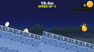 タップするといきなりゲームがはじまります。説明なしでもわかると思いますが、タップするとジャンプします。障害物を避けながら坂を転がり続けます。タップを2回するとダブルでジャンプします。