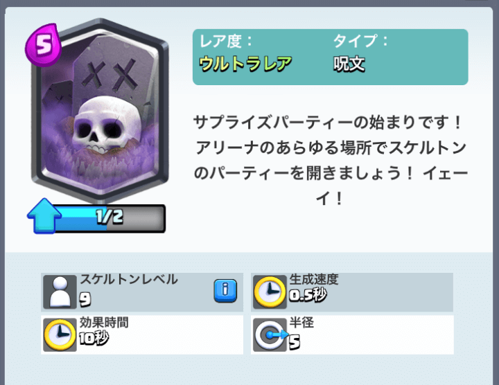 スケルトンラッシュのカードのステータス情報です。 レアリティ: ウルトラレア アンロック: アリーナ5 コスト: 5 タイプ: 呪文 生成速度: 0.5秒に1体のスケルトン 効果時間: 10秒 半径: 5