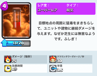 スケルトンラッシュには呪文であれば「ポイズン」が有効です。アップデートでポイズンのダメージが通るまでの時間が短縮されたので、生成されたスケルトンを瞬殺することができます。 スケルトンラッシュがコスト5で、ポイズンがコスト4なので単純比較でコスト1得をします!さらに呪文の場合には敵もどうしようもないので、ポイズンはスケルトンラッシュの天敵カードですね。