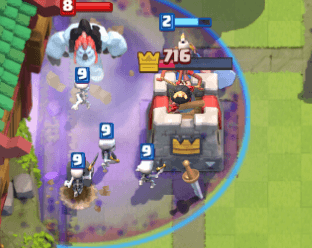 そこでスケルトンラッシュで攻めるには基本的には「ジャイアント」など盾となるカードを出して、その隙きにスケルトンラッシュでタワーを攻撃します。 一点だけ注意として スケルトンラッシュのサークルはかなり広いです!そのためサークルが中央のキングタワーを含めないように気をつけましょう。キングタワーにスケルトンが攻撃してしまうと、キングタワーも防衛体制となり、スケルトンラッシュの効果が半減します。