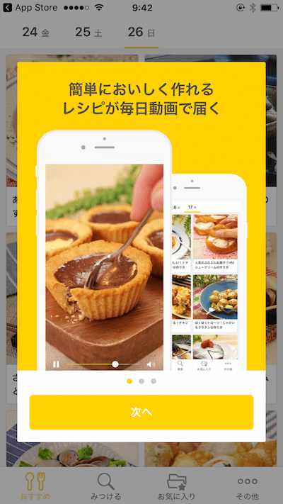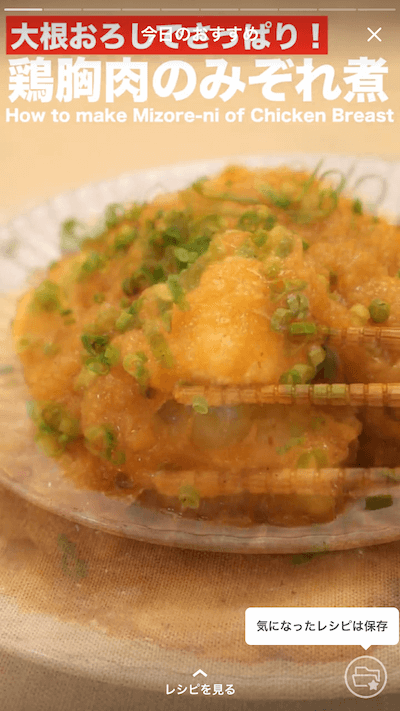 日ごとにタブが別れていて一日に大体8種類のレシピが紹介されてきます。気になるレシピがあればタップしてみましょう! レシピ動画がはじまります!