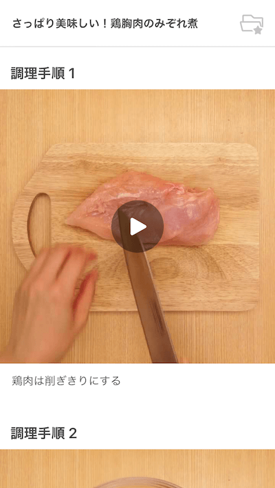 右下のアイコンをタップすることで今見ているレシピをお気に入りに入れることができ、あとでお気に入りとして振り返ることができます。