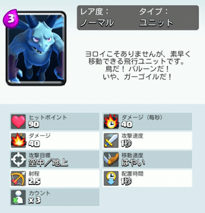 ・スパーキー ・ベビードラゴン ・アイスウィザード ・メガガーゴイル ・ガーゴイル ・インフェルノタワー ・ザップ という編成です。スパーキー以外は空に対して攻撃できるユニットを揃えています。スパーキーは空には攻撃できないので、対空ユニットをメインで使用します。 流れはスパーキーを出し、他のユニットでそのスパーキーをひたすら守り続けます。攻撃にかなりのコストを割くので守りでは重量級が来ても防衛できるインフェルノタワーを基本に守ります。