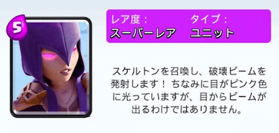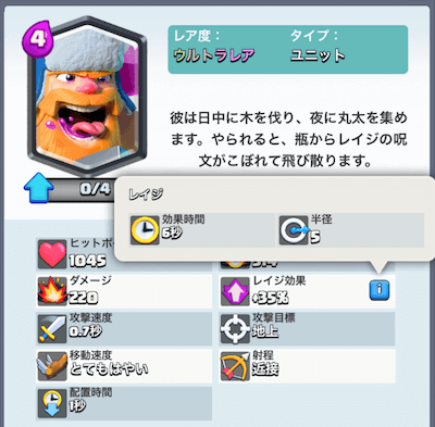 とくに攻撃速度0.7は移動速度を含めエリートバーバリアンよりも早いので、コスト4でこれだけのステータスを持っていてレイジの効果も併せ持つという点ではさすがウルトラレアカードという感じです。