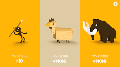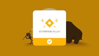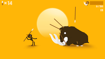 ヤリをなげてマンモスを攻撃しよう!操作はとてもシンプル。画面をタップすると、キャラクターが後ろに後退します。マンモスの攻撃を後ろに下がって避けましょう。 またキャラクタを後ろにスワイプすることで、槍を構えます。槍の発射方向を定めて指を離すと槍を投げます。 槍がマンモスに当たるとマンモスはダメージを受けます。右上に表示されているマンモスのHPを0にすればゲームクリアになります!