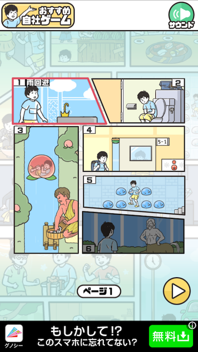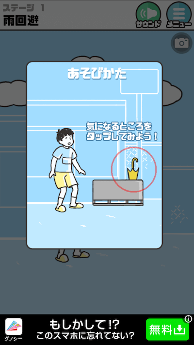 無事に傘をさしてステージクリアです!!最初のステージは簡単ですね♪ 次のステージ以降アイテムの発見やアイテムの使い方で悩まされる場合が多々でてきますw ほとんど一発でクリアするのは無理ではないかというほど・・ そんなときはヒントを見るようにしましょう!