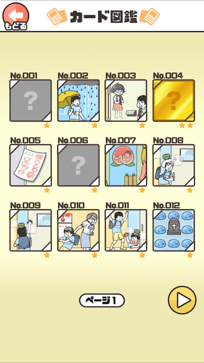 神回避のシーンは図鑑に残ります。各ステージで成功したとき、失敗したとき、その他のシーンが図鑑として後で振り返ることができます。こう見ると最初のステージで図鑑に載っていないものがありますね。 一発で成功させてしまったので、、、ということは失敗をすれば・・・ という具合に色んなパターンを試し図鑑をコンプしていきましょう! 図鑑がどうしてもうまらないときは「?」の部分をタップしましょう。ステージのときと同じくヒント動画が出てきますので、動画を見るとまたヒントが表示されます。ヒントを頼りに図鑑を埋めましょう!