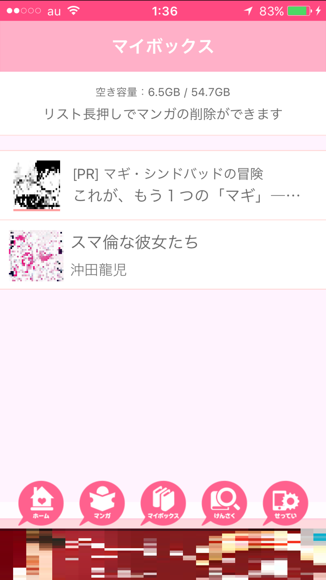 マンガを読むのにあらかじめ作品のデータをダウンロードしておく必要があるのですが、空き容量が少なくなると、新しい作品が読めなくなります。もう読み終わったので、いったんデータを削除したいという場合は、「マイボックス」メニューから作品名を長くタップすることで削除できます。