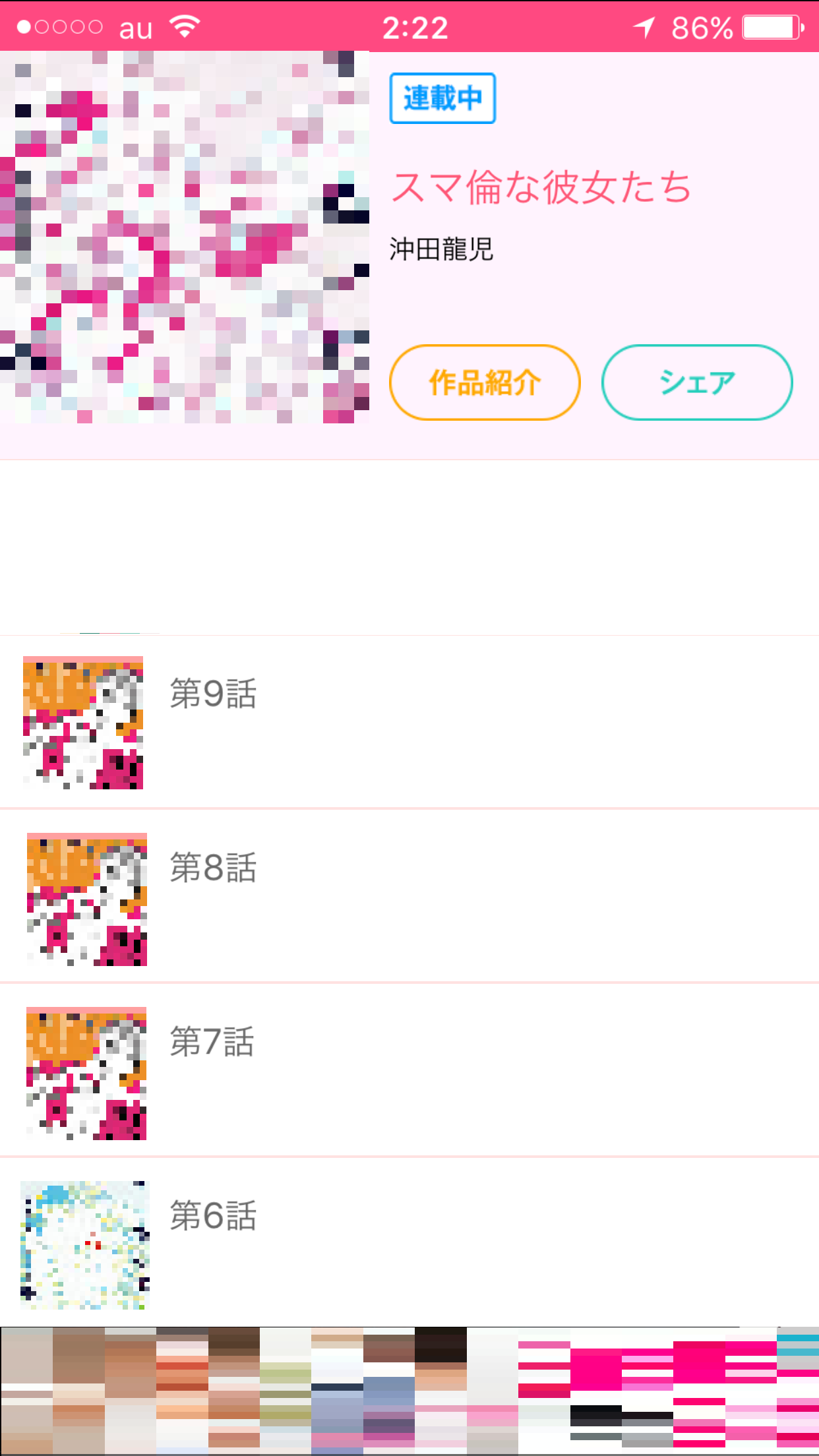 読みたい作品を選ぶ時に使用します。 ・ ランキング: ダウンロード数による人気ランキングが10位までのものを中心に紹介しています。 ・ ジャンル別: 恋愛/大人の恋愛/ドラマ/冒険/サスペンス・ミステリー/ペット/コメディ/ボーイズラブ/その他に分けられています。 ・ 新着: 最近配信が開始されたマンガが掲載されています。 作品のタイトルをタップすると1巻から最新巻までの一覧が表示されます。「作品紹介」をタップすると、あらすじが確認できます。「シェア」をタップすると、FacebookやTwitter、LINEで作品を友だちに勧めることができます。 読みたい巻のタイトルをタップすると、マンガのデータがダウンロードされます。データをダウンロードすることで空き容量が減ってしまうのですが、オフライン環境でもマンガが読めますので、電波の届きにくい場所や、地下鉄などに乗っていて電波が途切れそうな場合でも読み続けられますね。