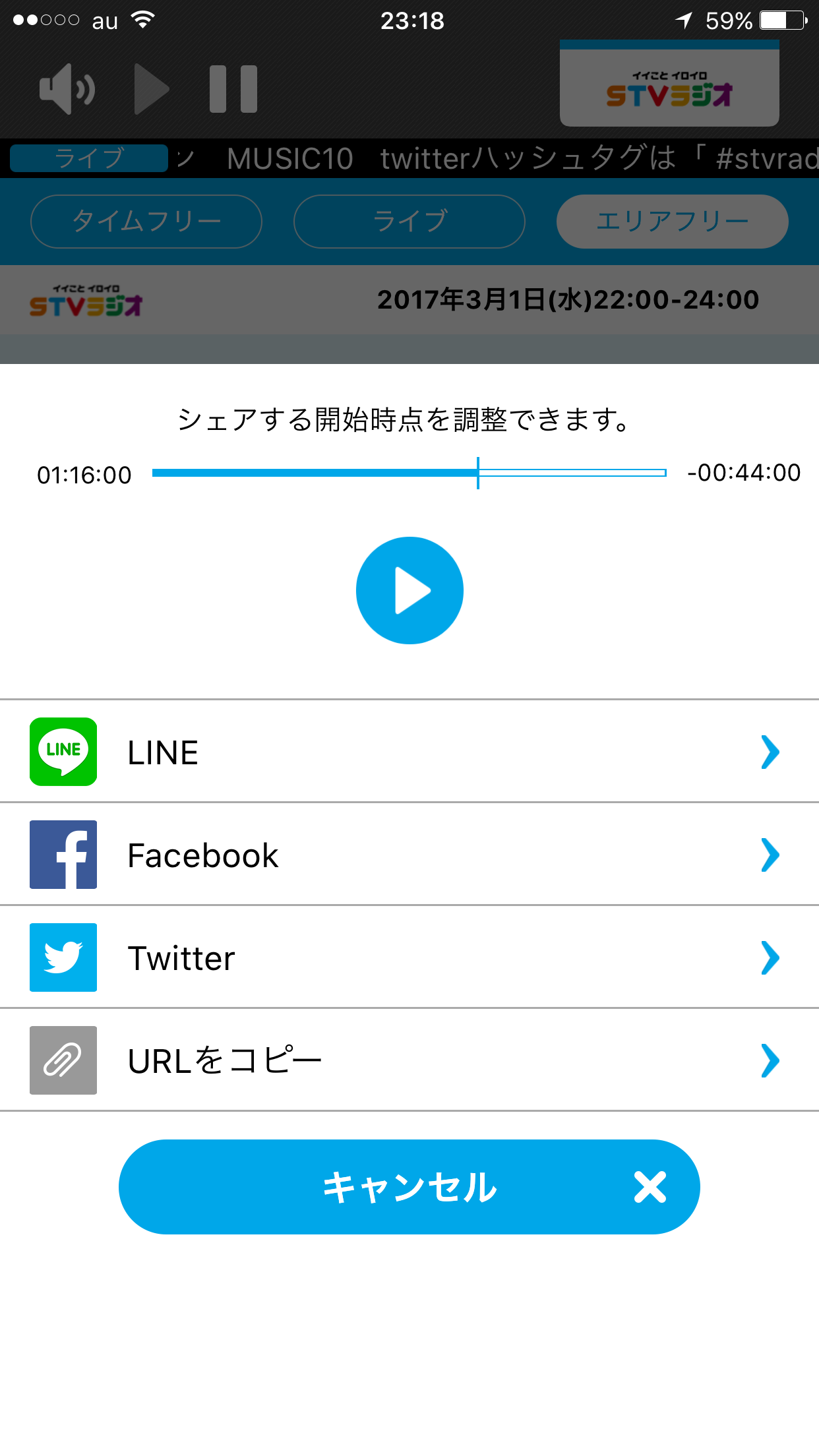 「シェア機能」により、番組の音声データをLINEやFacebookなどでシェアすることができます。