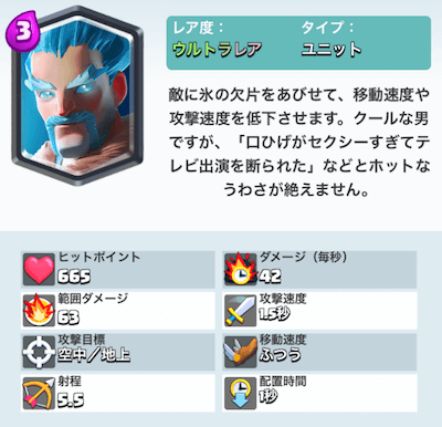 アイスウィザードは古参のウルトラレアカードで特徴としてはその攻撃に敵ユニット・タワーをスローにさせる効果があるところです。単体としてのダメージは低いですが、スロー効果をうまく使って他のカードとセットで攻めましょう!うまく使えば攻撃と防御でかなり活躍してくれるカードとなります。他のウルトラレアの登場で一時期より人気は落ちましたが依然として使っているプレイヤーも多いカードです。デッキに入れると安定感が増します。 更に詳しいアイスウィザードの使い方やおすすめデッキと対策をご紹介!