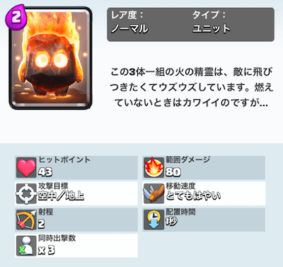 ファイアスリピットは少し特殊なユニットで、近くにいる敵ユニットや施設に飛び込み範囲ダメージを与えます。そのファイアスピリットを3体出現させます。移動速度はとても早く、このダメージは地味に大きく痛いです。 特に空のガーゴイルの群れなどはこのカード1体処理できるので、天敵のカードとなっています。上手く相性のいいカードにぶつけたときのメリットが大きいカードです。 一方で敵に飛び込んだらユニットは消えるので、例えばミニペッカのようなターゲットを集めたい場合には防衛力は無いに等しいので、そういう場合には向きません。