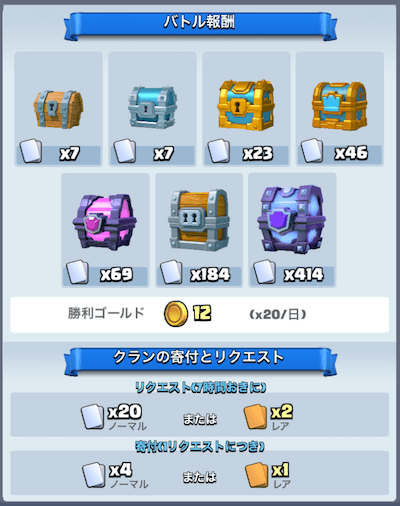 アリーナ5では新たにそれぞれのレアリティのカードが2種類ずつ追加されています。カードの種類が多くなり、狙ったカードは出にくくなりますがその分一つの宝箱から入手できるカード枚数は増えます。 順番にご紹介していきます。まず勝利ゴールドですが、これはアリーナごとに2ゴールドずつ増加ですね。アリーナ5では「12ゴールド」入手できます。一日の上限回数20回には注意しましょう。 次に寄付リクエスト数と、寄付数ですが 寄付リクエスト: ノーマルx20、レアx2 寄付数: ノーマルx4、レアx1 とリクエスト、寄付数ともに増加しています。カードのアップグレードには同種のカードとゴールドが必要になってくるので、その分寄付数であったり寄付リクエスト数が増加しています。