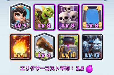 このデッキはクランタワーを1つ削り倒すのに向いています。ゴブリンバレルでタワーに奇襲をかけ更に「鏡」を使って2発目のゴブリンバレルでタワーに攻撃をしかけます。 一方で建物はオーブンを設置し、タワーに対してファイアスピリットで地味にダメージを与え続けます。敵が建物を設置したらタワーを巻き込んでファイアーボール・・・という具合にとにかくタワーのダメージを与えていき削り倒すという戦術となります。
