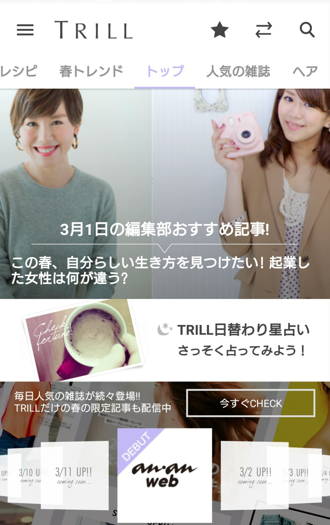 イベント/特集/ビューティー/診断/恋愛/ファッション/ダイエット/ライフスタイル/エンタメ/アプリ/バズ これだけのカテゴリの情報が『TRILL[トリル]』という1つのアプリにすべてつめ込まれています。 カテゴリの選びたは左右にスワイプてカテゴリを選びます。