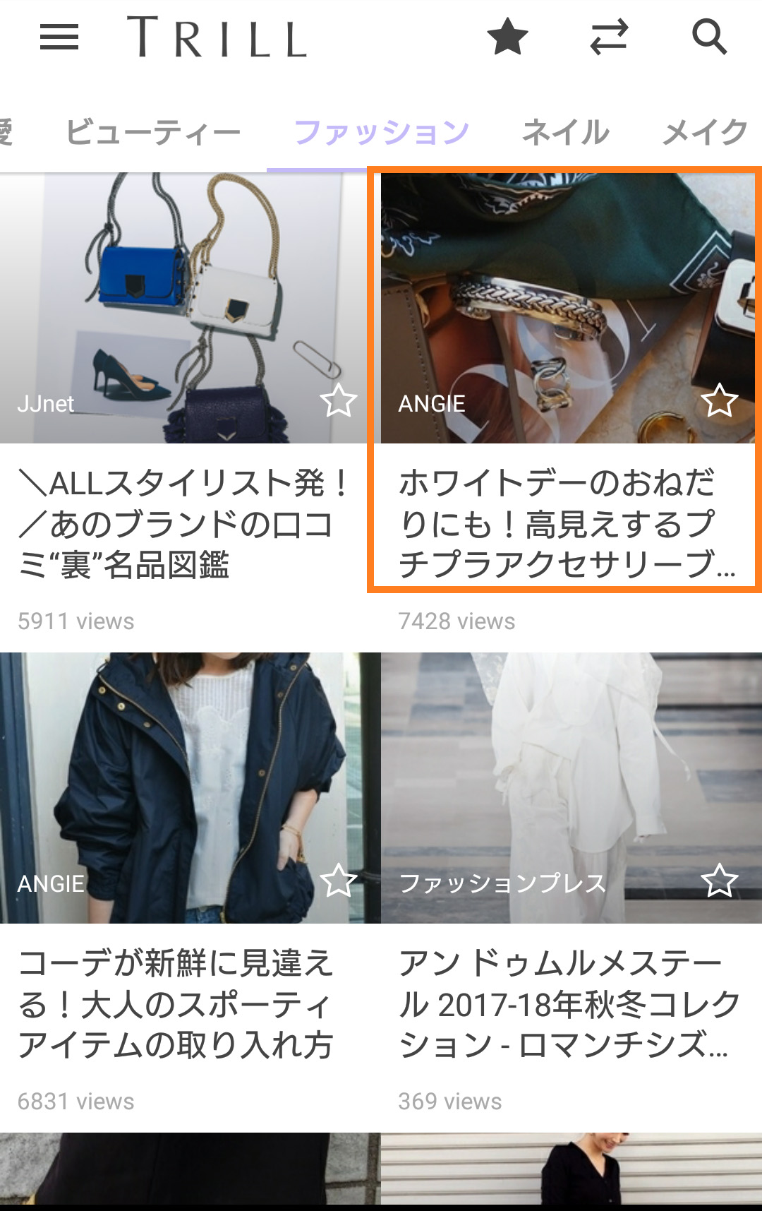 これだけのたくさんの記事があると、また読みたくて次に記事を探そうと思うと、すごく苦労しそうですよね。 そんなときのために、『TRILL[トリル]』では記事の「お気に入り」ができます。 記事を「お気に入り」すると、「お気に入り」した記事を一覧にまとめることができ、とても便利なんです!
