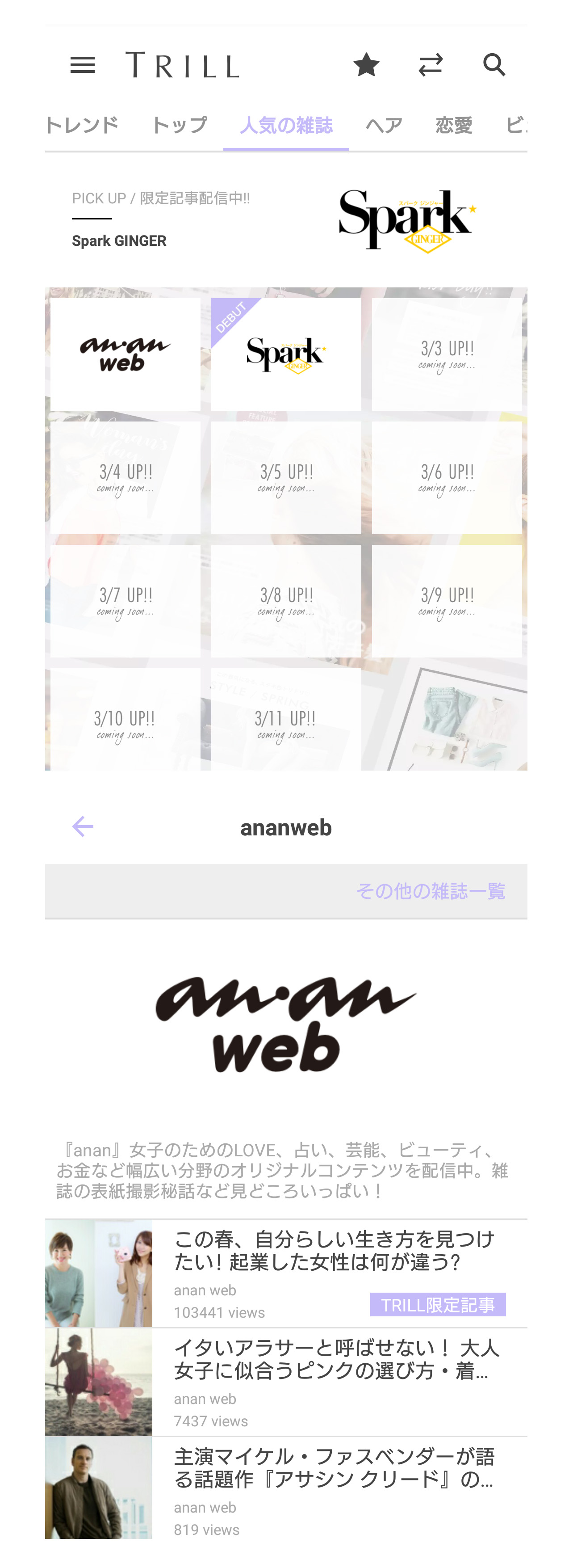 カテゴリ『人気の雑誌』では、『TRILL[トリル]』でしか読めない人気雑誌のWeb限定の記事が読めます。