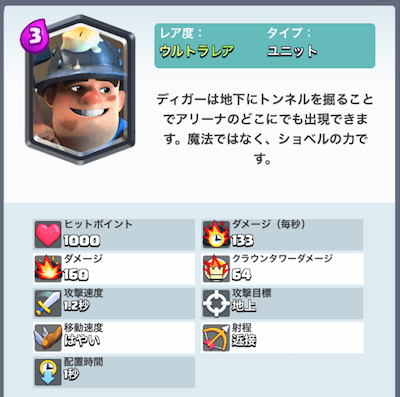 ディガー(穴掘り師)の基本性能は以下の通りです。 レアリティ: ウルトラレア タイプ: ユニット コスト: 3 アンロック: アリーナ6 攻撃目標: 地上 射程: 近接 配置時間: 1秒 移動速度: はやい 攻撃速度: 1.2秒