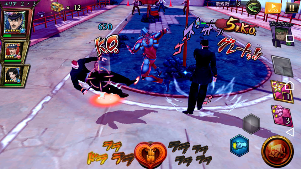 3Dモデルで再現された原作アニメでおなじみのステージを、自由に歩き回ることができます。 こちらも原作アニメに沿って忠実に再現さているので、歩き回るだけで楽しいですね。 しかも、バトルシステムは超シンプル。 画面上をスワイプしてキャラを移動させ、右側のアクションボタンで攻撃するだけです。 おなじみのステージで、敵を倒して暴れましょう!
