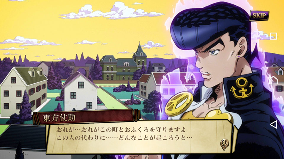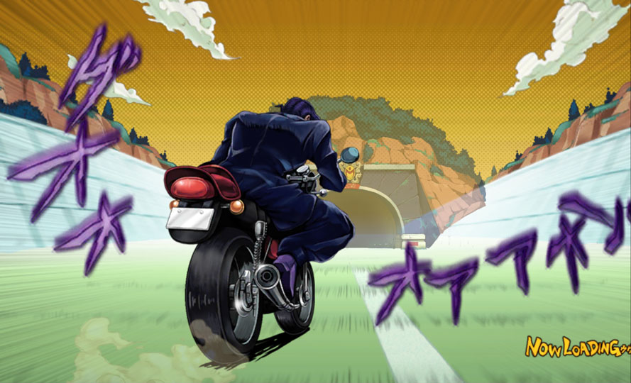 ゲーム内のコミュニティ「タウン」に向かうと、「東方仗助」がバイクで向かう演出が流れます。