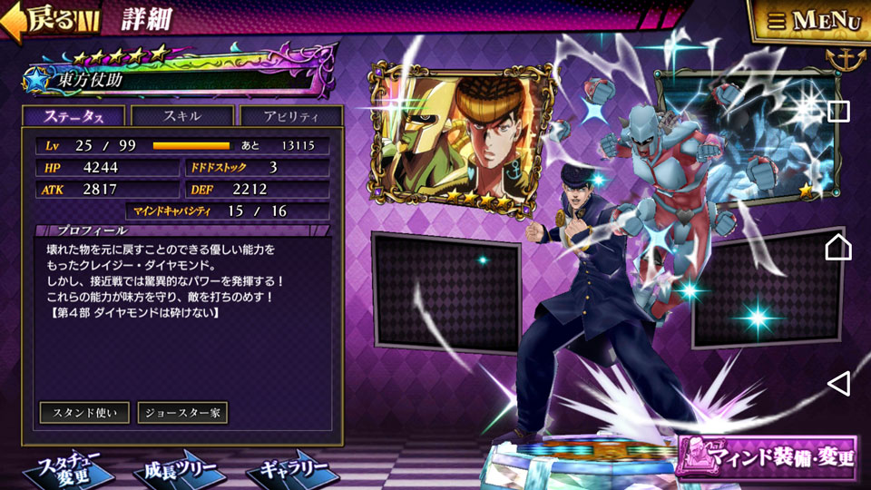 ジョジョの名場面を絵にした『マインド』をキャラクターに装備させることができます。 『マインド』をキャラクターに装備させると、能力を大幅にアップさせたり、技を取得できたりします。